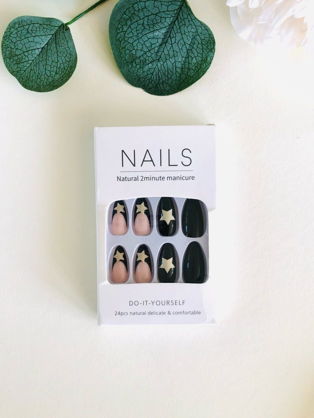Laatikko sisältää 24 eri kokoista kynttä, viilan ja liimatarrat