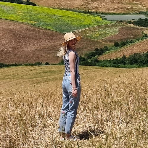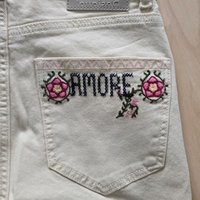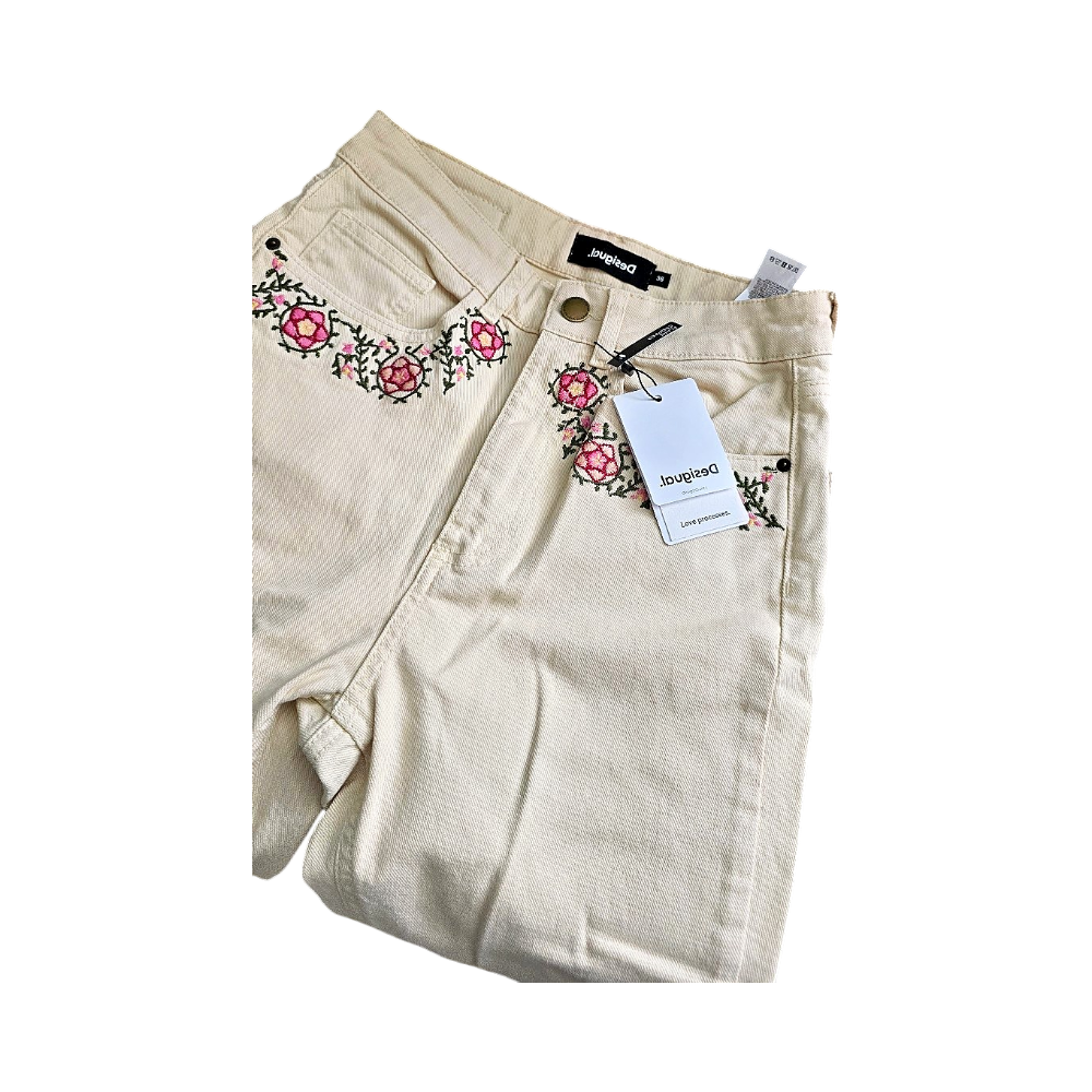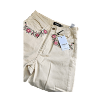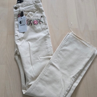 Malli on levenevä ja nilkkapituinen. Vyötärö on korkea. Edessä ja takana kukkakirjailua. 98% puuvillaa. Alkuperäinen hinta n. 100e.