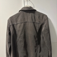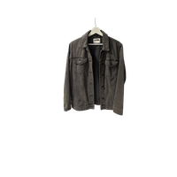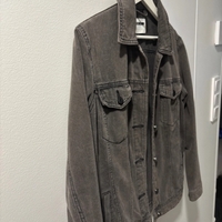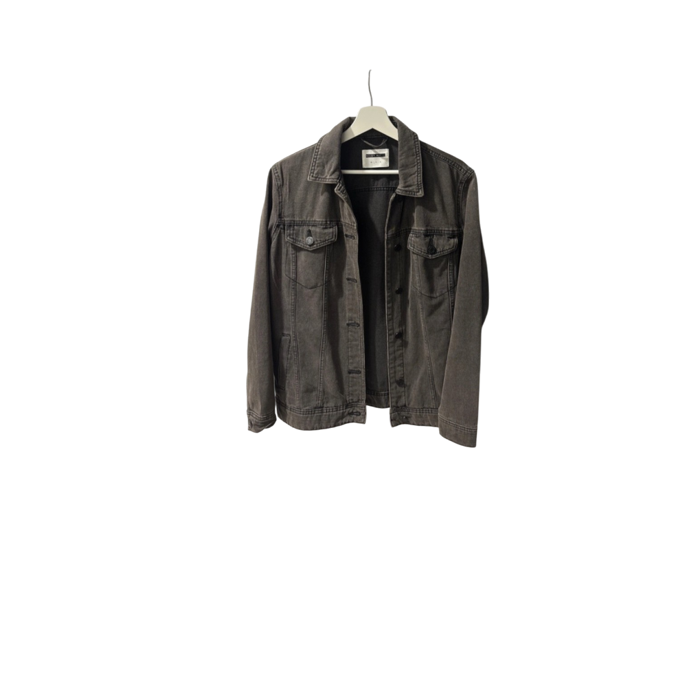 Väljä harmaa farkkutakki, napit edessä, taskut rintamuksessa.