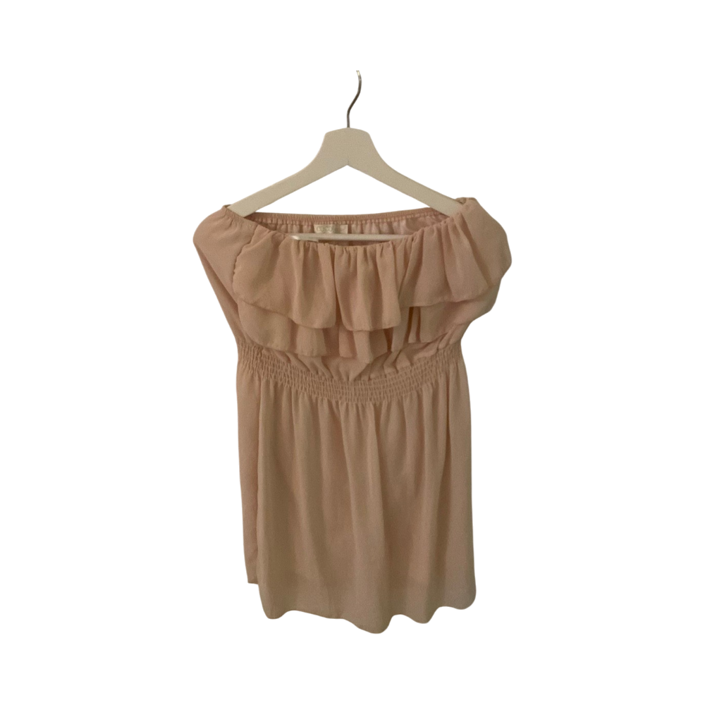 Off-shoulder mekko volangilla ja smokkivyötäröllä.