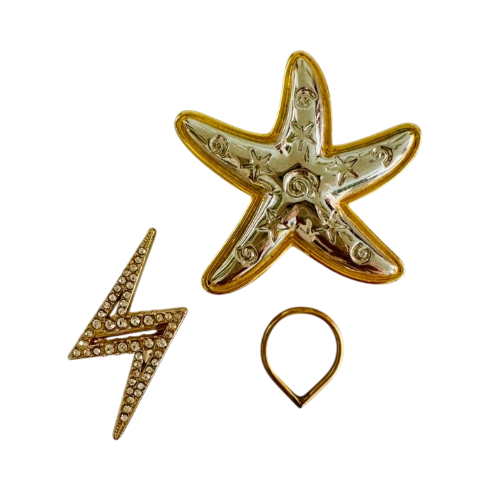 Kolmen korun setti: vintage rintaneulat meritähti ja salama sekä muotoiltu sormus.