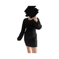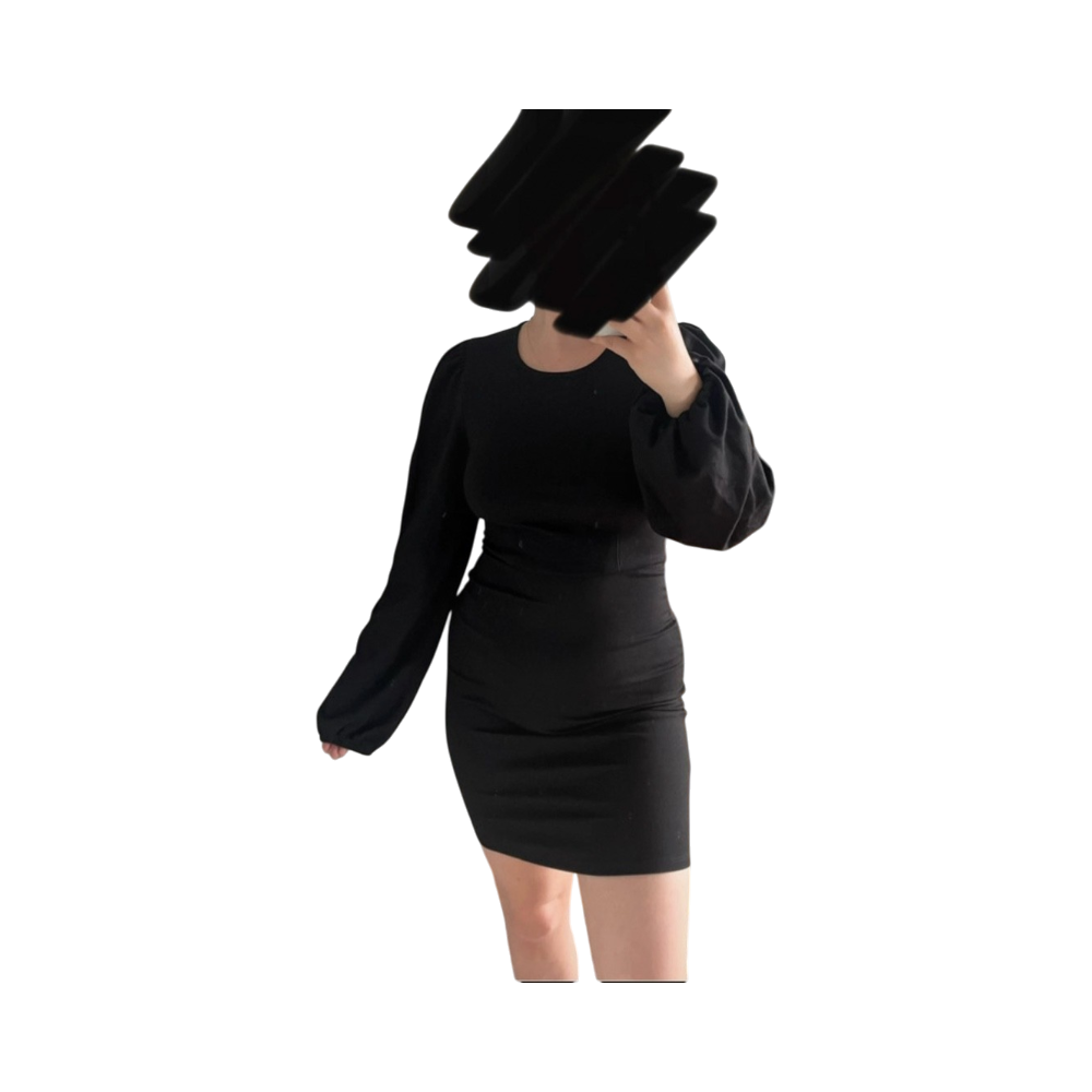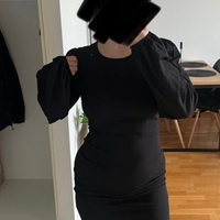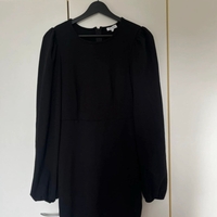 Lyhyt musta juhlamekko, pitkät liehutakitut hihat.