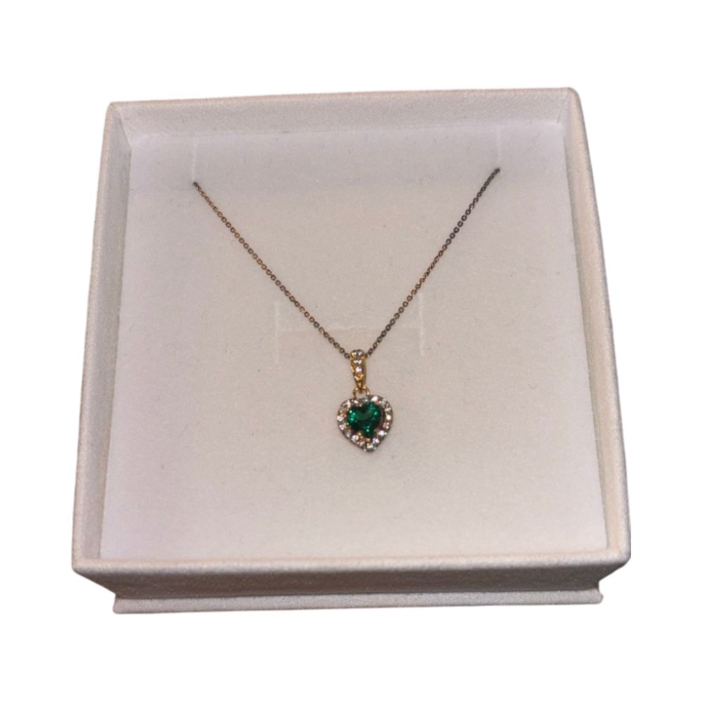 Käyttämätön hopeinen kaulakoru, vihreä sydän zirkonia.