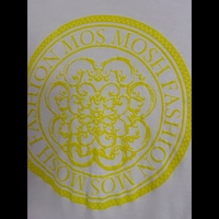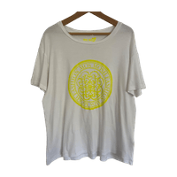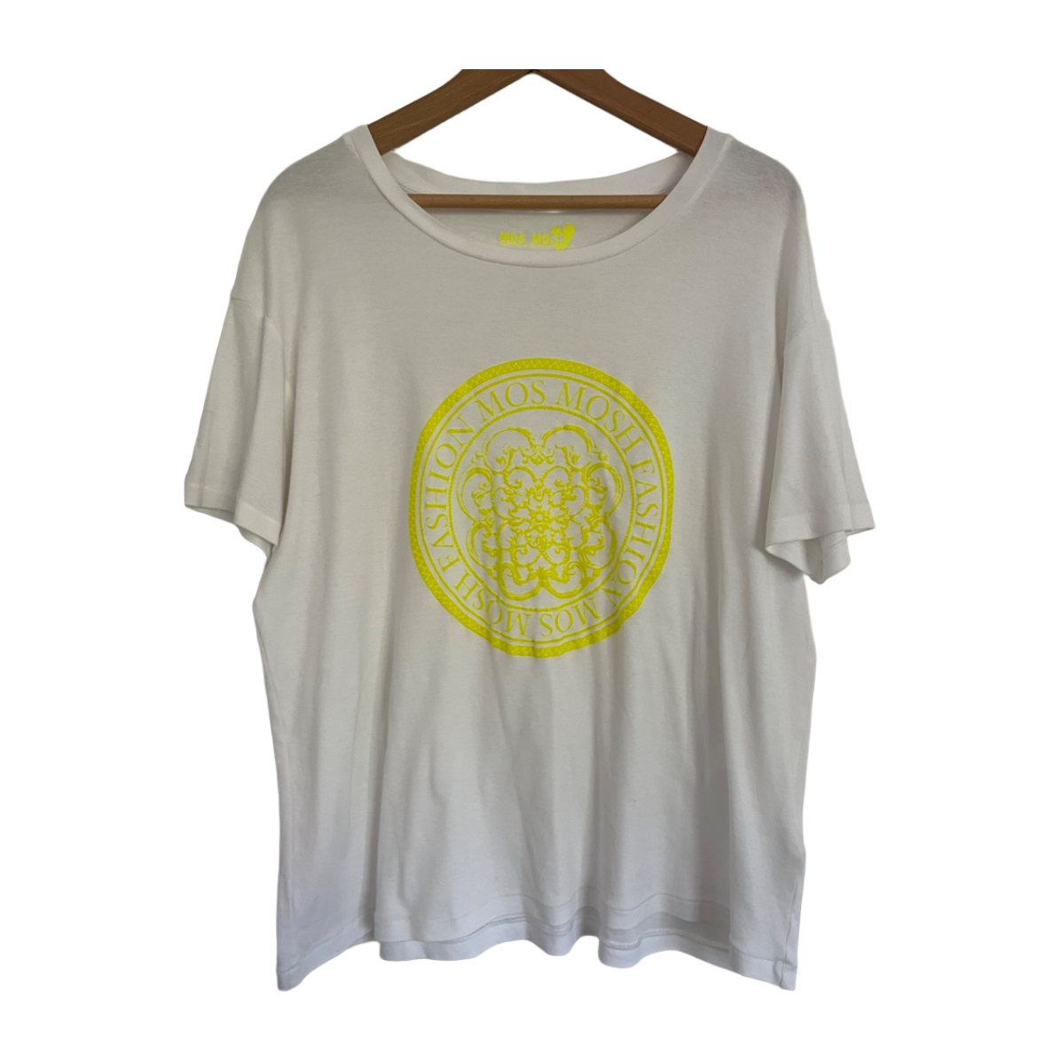 Valkoinen perus t-paita, jossa ne on keltainen kuvio.