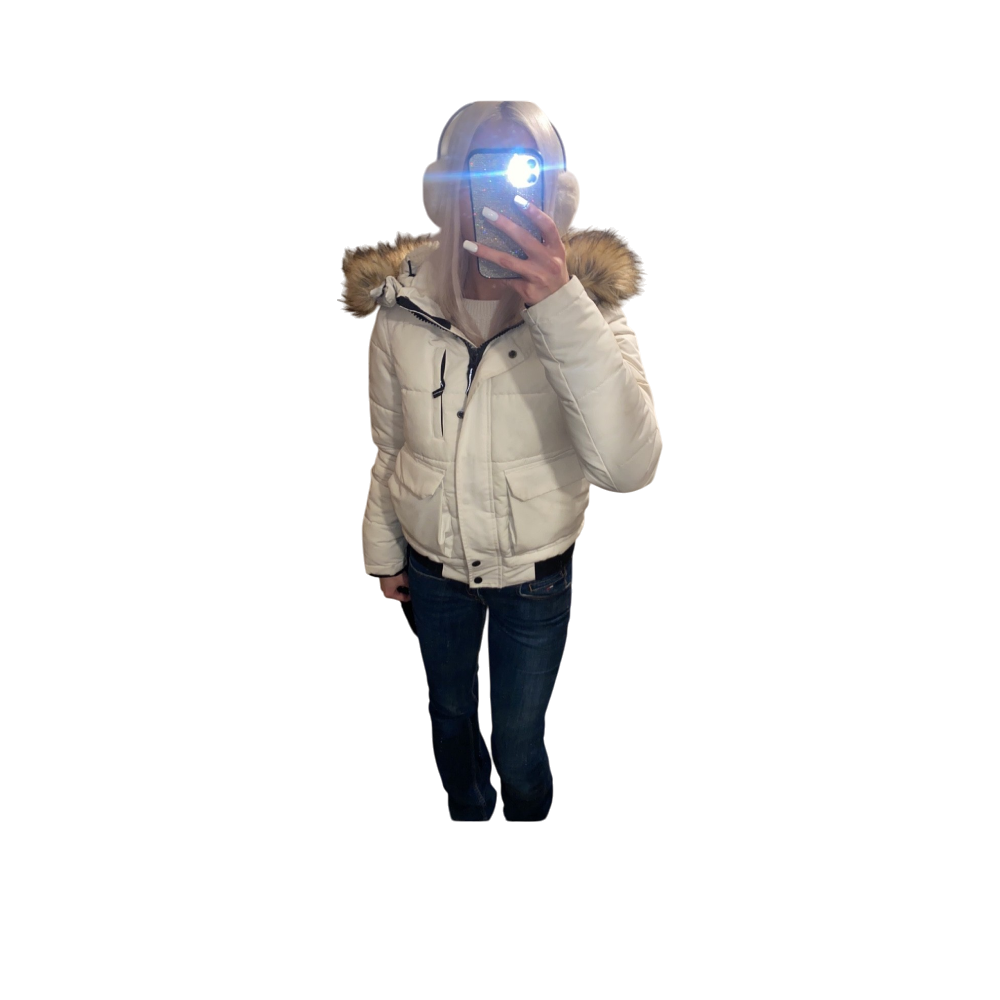 Käytetty jonkun verran mutta ei kauheasti käytön jälkiä. Hupun karva on irroitettava.