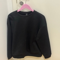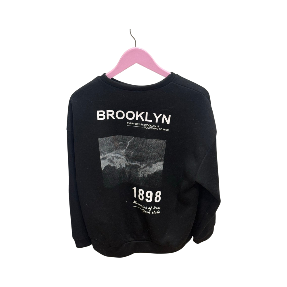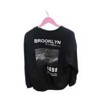 Musta oversized collegepaita, painatuksella selässä.