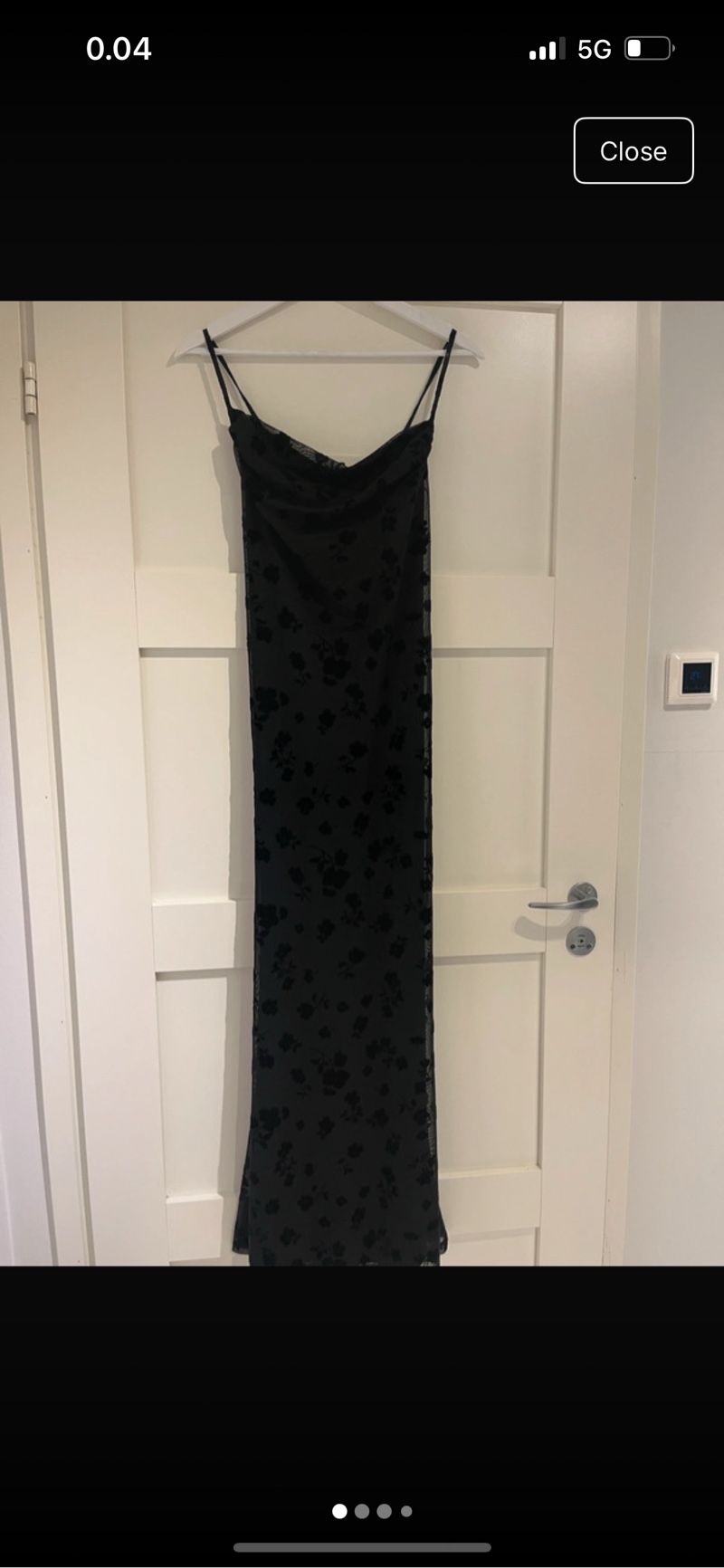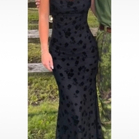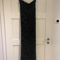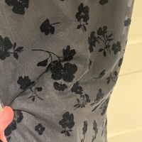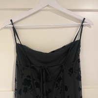 Long black slip dress with flocked floral overlay and thin straps.