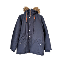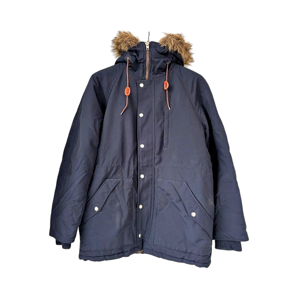 Miesten tummansininen talvitakki / toppatakki / lämmin parkatakki. Koko S, reilumpaa kokoa, ks. tarkemmat mitat alta. Merkki Vailent Clothing, ostettu Carlingsilta. Takki on erinomaisessa kunnossa. Hupun karvareunuksen saa kokonaan irti ja kiinnitettyä neppareilla. Huppuosa ei saa irti takista. Vyötäröä saa säädettyä säätönyörillä. Edessä taskut ja yksi rintatasku. Takin sisällä myös yksi rintatasku. Savuton koti, ei lemmikkejä.
