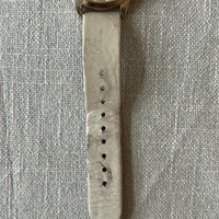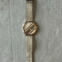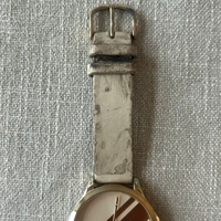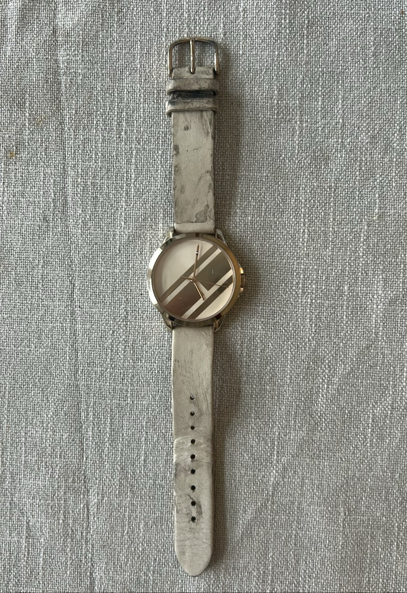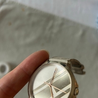 The leather has stains and discoloration from somewhere. Also scratches on the watch glass. The watch does not work and replacing the battery does not make the watch work.