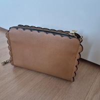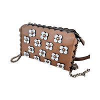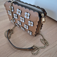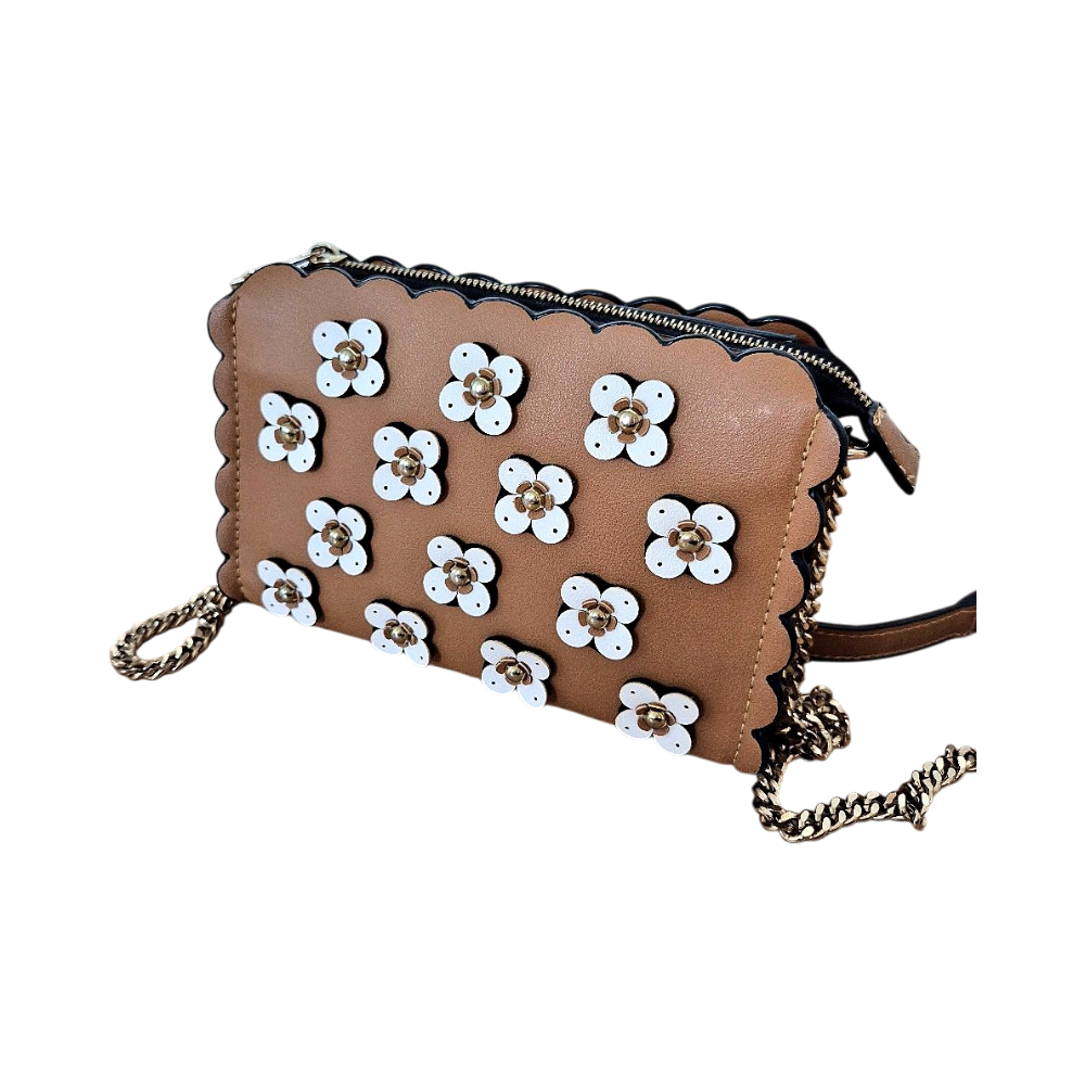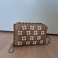 Tyylikäs ruskea/tan värinen laukku valkoisilla kukkakoristeilla. Käytön jälkiä, katso kuvat. Leveys 20cm, korkeus n.14cm ja syvyys 6cm.