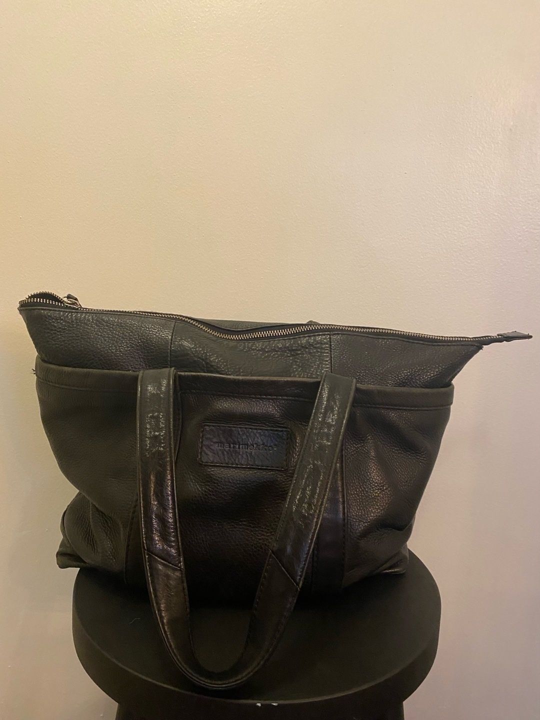 Marimekon musta nahkaa oleva matkuri laukku. Pientä ajanpatinaa, mutta oikein hyvässä kunnossa. Vetoketjut toimivat moitteetta. Tilava arkilaukku. Leveys noin 43cm, korkeus noin 30cm, pohjan leveys noin 14cm.