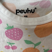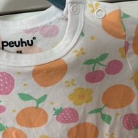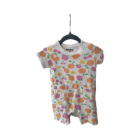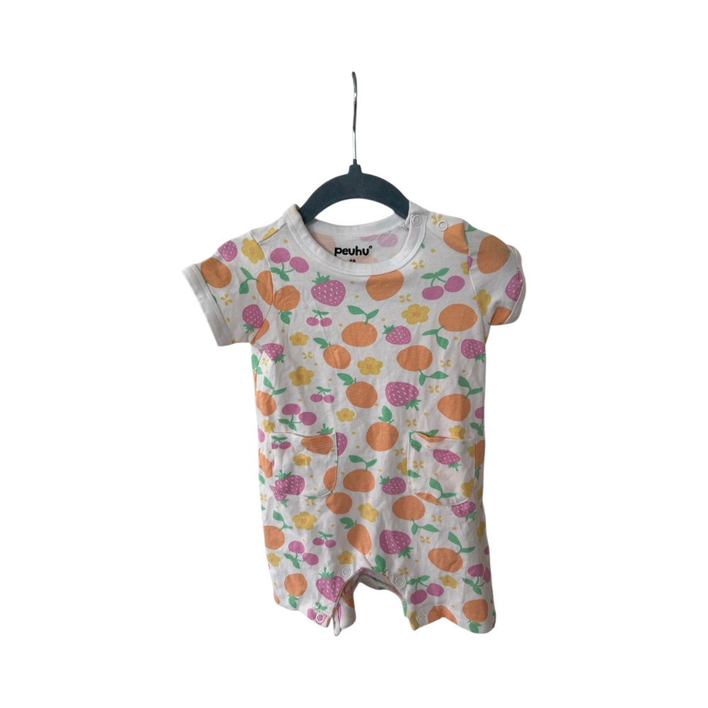 Vauvan lyhythihainen haalari. hedelmäkuvio, napit olkapäissä ja haarassa. Uusi, kerran pesty vaan.