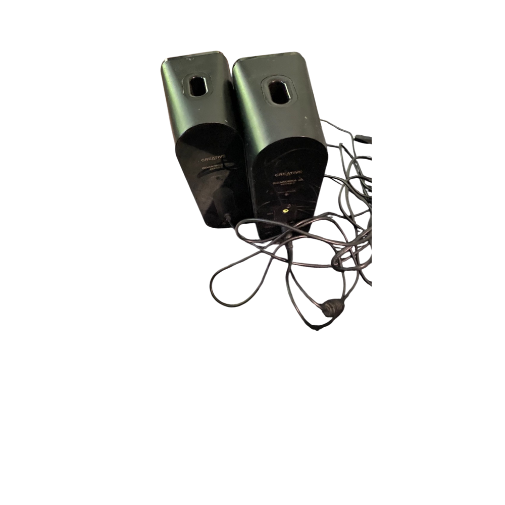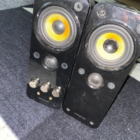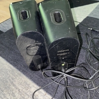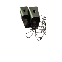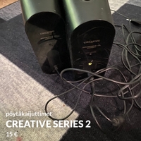 Pari pöytäkaiuttimia tietokoneelle, toimivat johdoilla.