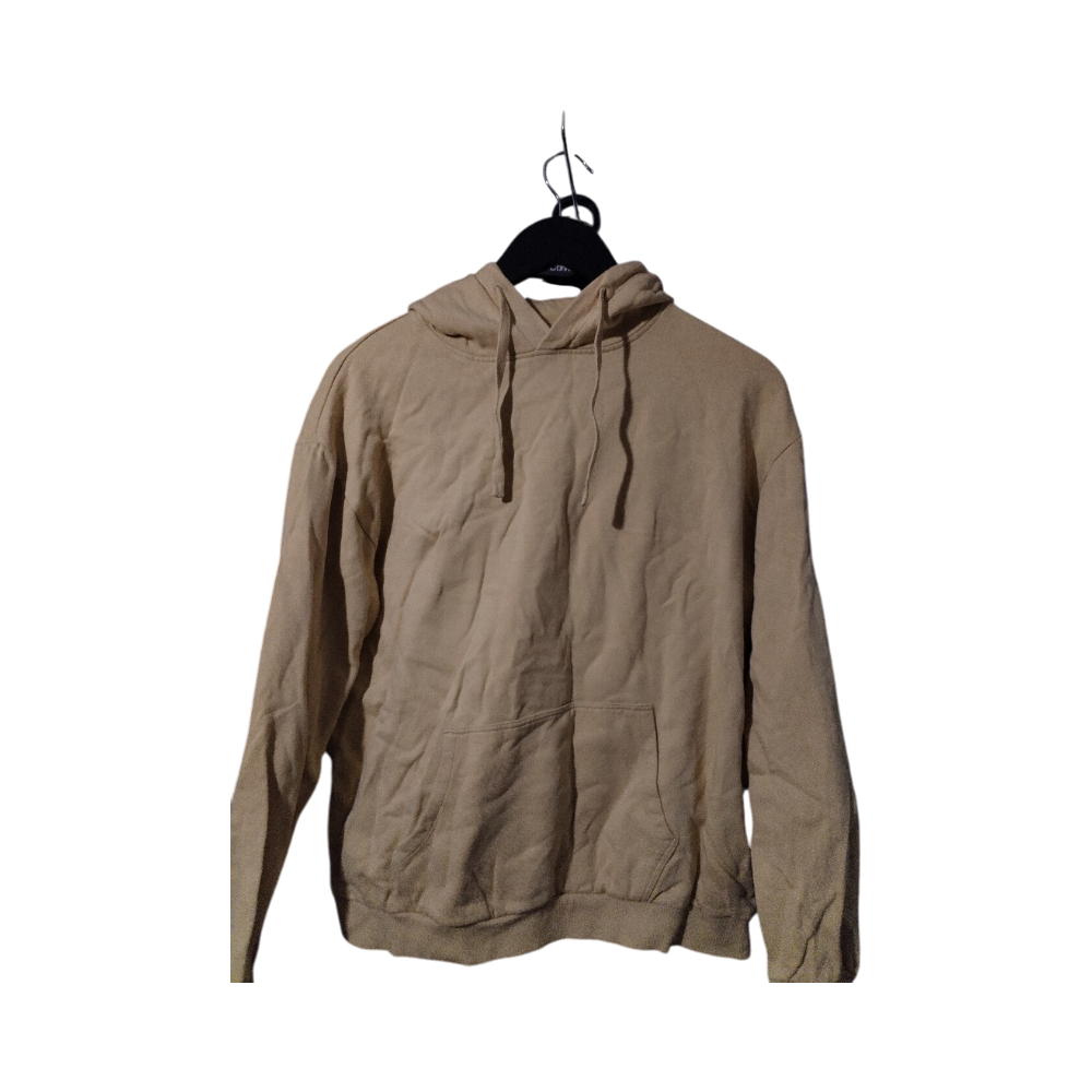 Yksivärinen keltanen huppari, edessä tasku ja kiristysnyörit.