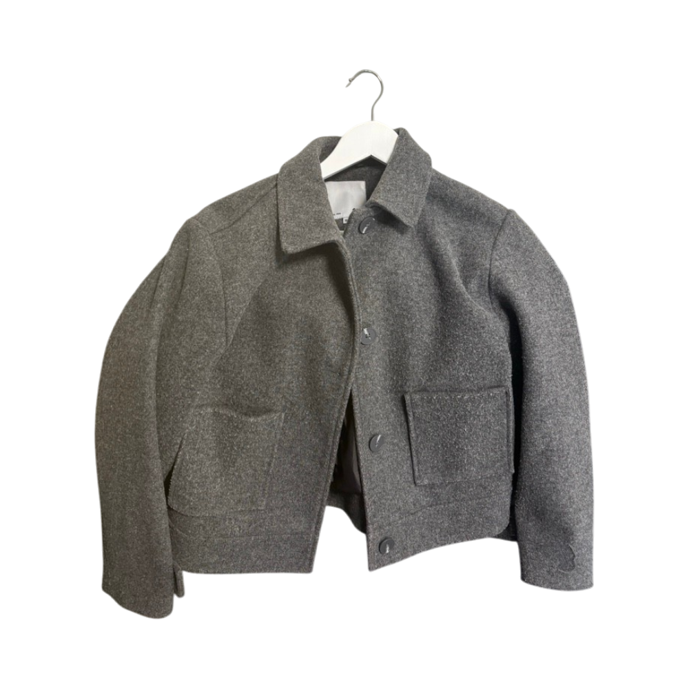 Lyhyt harmaa villakangastakki napituksella, taskut edessä.
