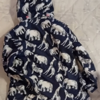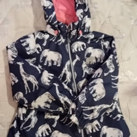 Siisti takki. Sinipohjainen valkoisin eläinkuvioin ja persikanvärisin tehostein. Hyvä muotoilu. Koko 122cm.