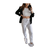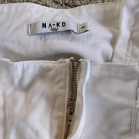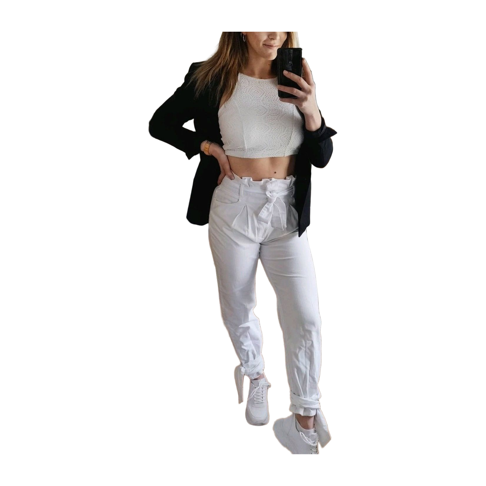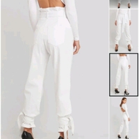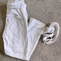 Koko 40, korkeavyötäröiset, lantiolla nauha minkä saa kokonaan pois jos haluaa, myös lahkeissa nauhat, mitkä on ommeltu kiinni. Edessä piilovetoketju. Joustavat hieman, mutta eivät paljoa.