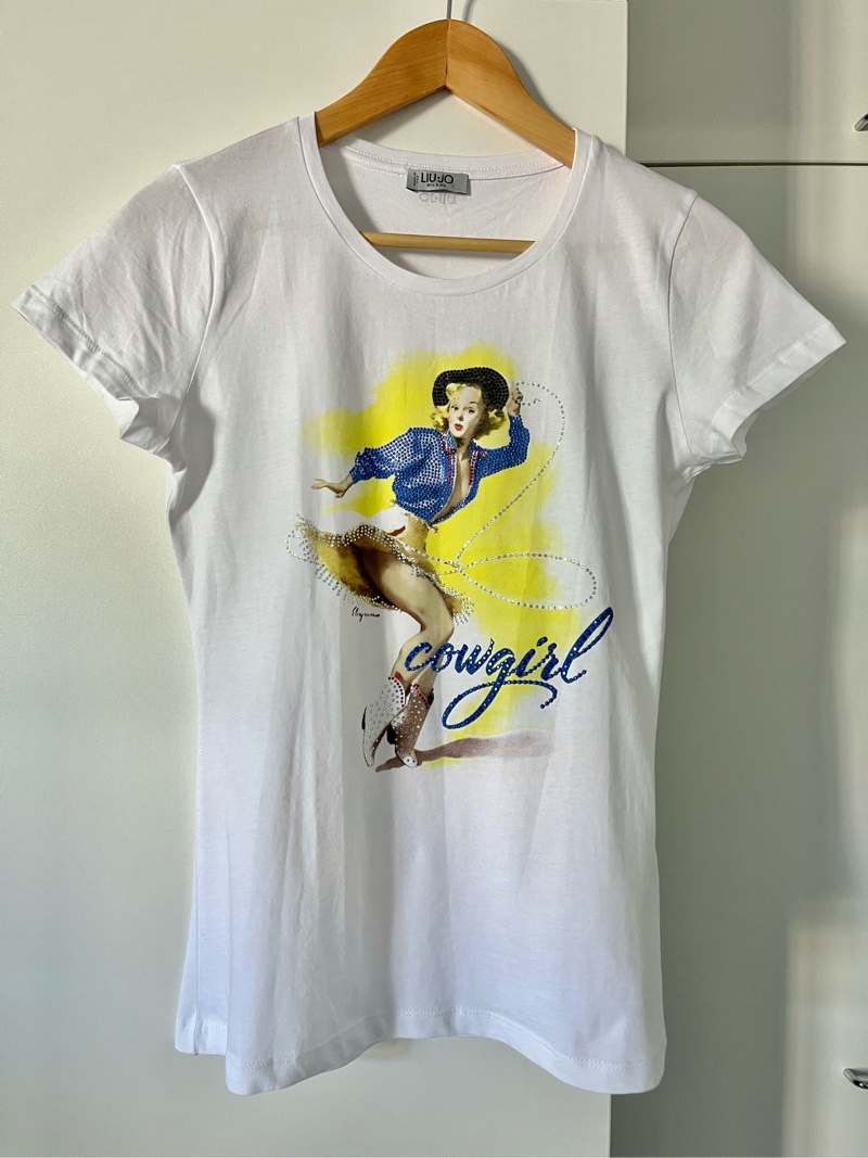 Liu Jon valkoinen lehmityttö printti t-paita 100% puuvillaa koossa S. Paita on uuden veroisessa kunnossa ja kaikki strassit ovat paikallaan. Made in Italy