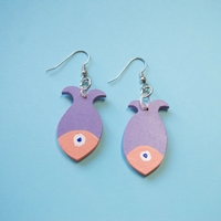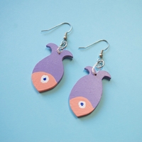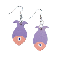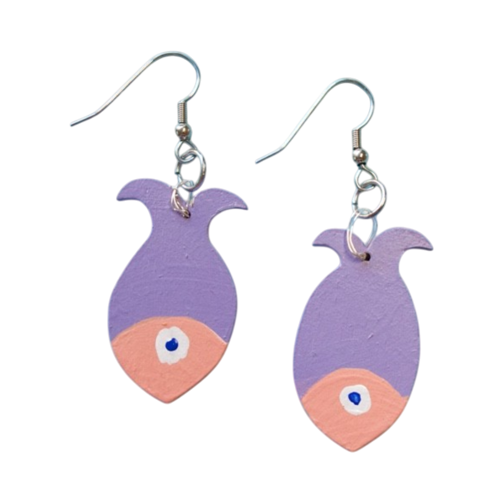 Hand-painted purple and peach wooden dangle earrings. Sterling silver hooks