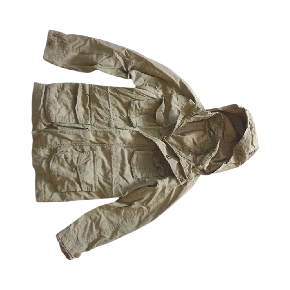 Kevyt hupullinen takki, taskut edessä, rento malli. Hyvä vetoketju.