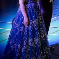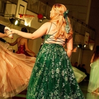 Mekkoa lyhennetty ompelijalla, sopii n. 160 cm pitkälle (tai muutaman sentin pidemmällekin) tanssijalle. Ompelijalla kavennettu myös rinnanympärystä, lyhennetty olkaimia ja lisätty lisäpeittävyyttä yläosaan.