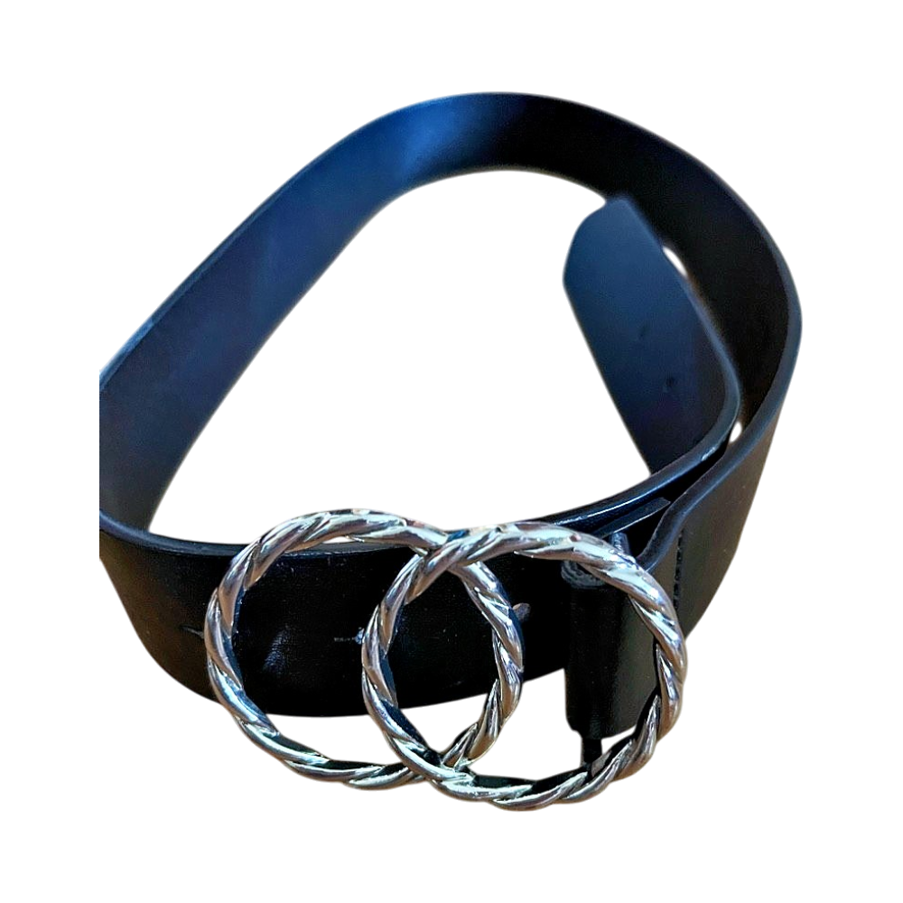 Naisten musta vyö hopeaisella pyöreällä soljella.