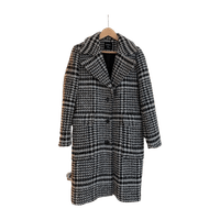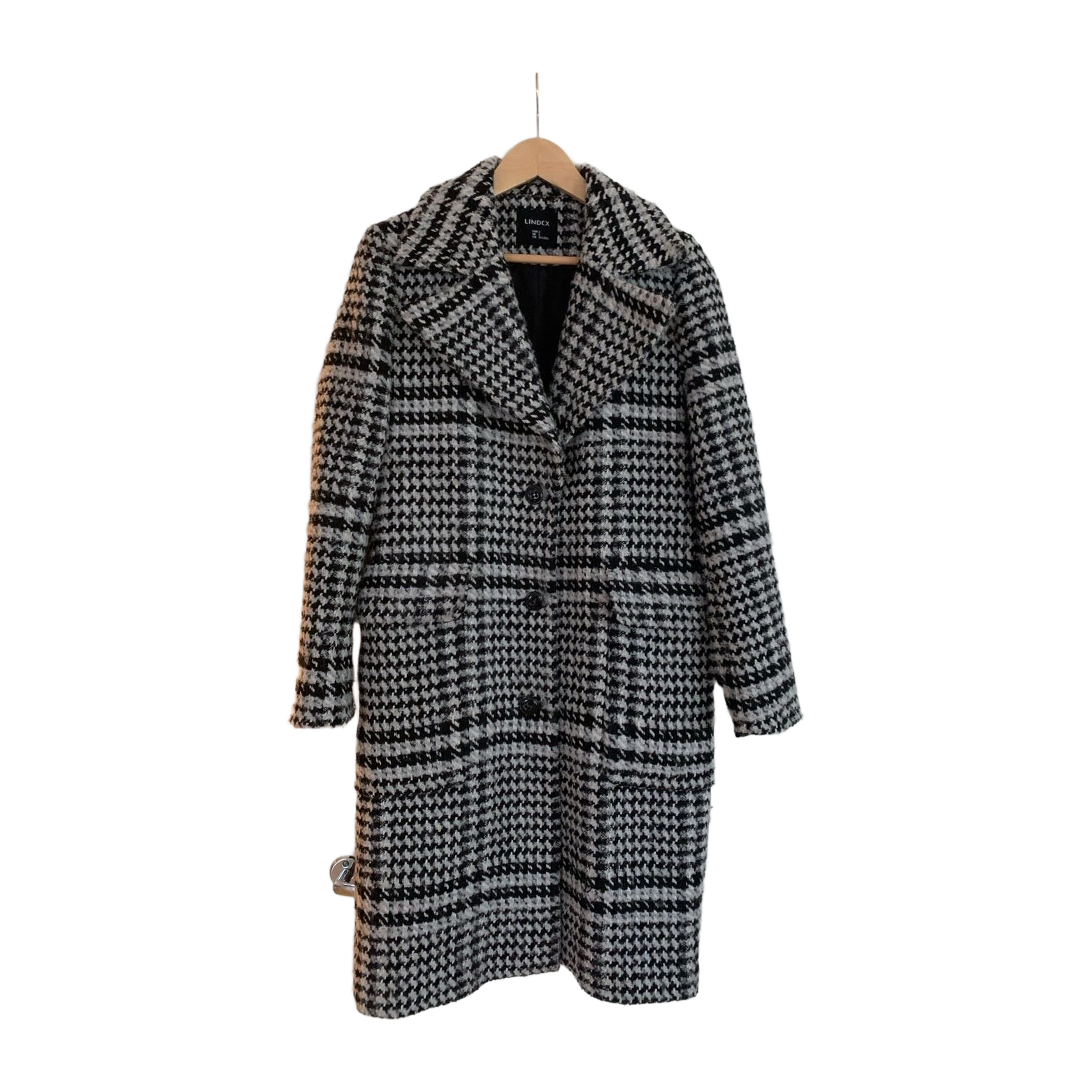 Ihana kukonaskelkuvioinen villakangastakki (Lindex). Koko 36, mutta sen verran reilu, että menee hyvin 38-kokoisellekin. Hyvin vähän käytössä ollut, joten kunto on siisti, ehjä ja moitteeton. Savuton/lemmikitön kotitalous.