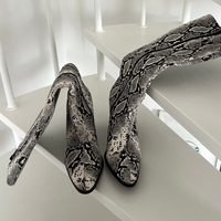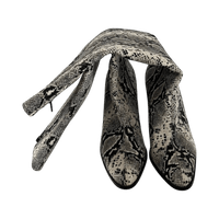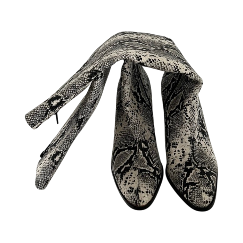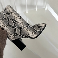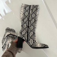 Mango polvipituiset käärmekuosiset bootsit. Vetoketjut sisäsyrjissä. En löytänyt materiaalimerkintää, joten en tiedä ovatko nahkaa, mutta veikkaan, että nahkajäljitelmää. Olleet vain kerran päällä ulkona kuvauksissa, joten käytännössä ihan uutta vastaava kunto. Koko normaali 39, voisi sopia myös 38,5.