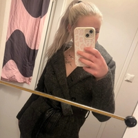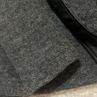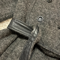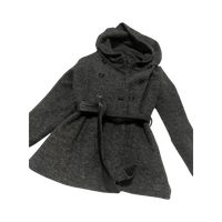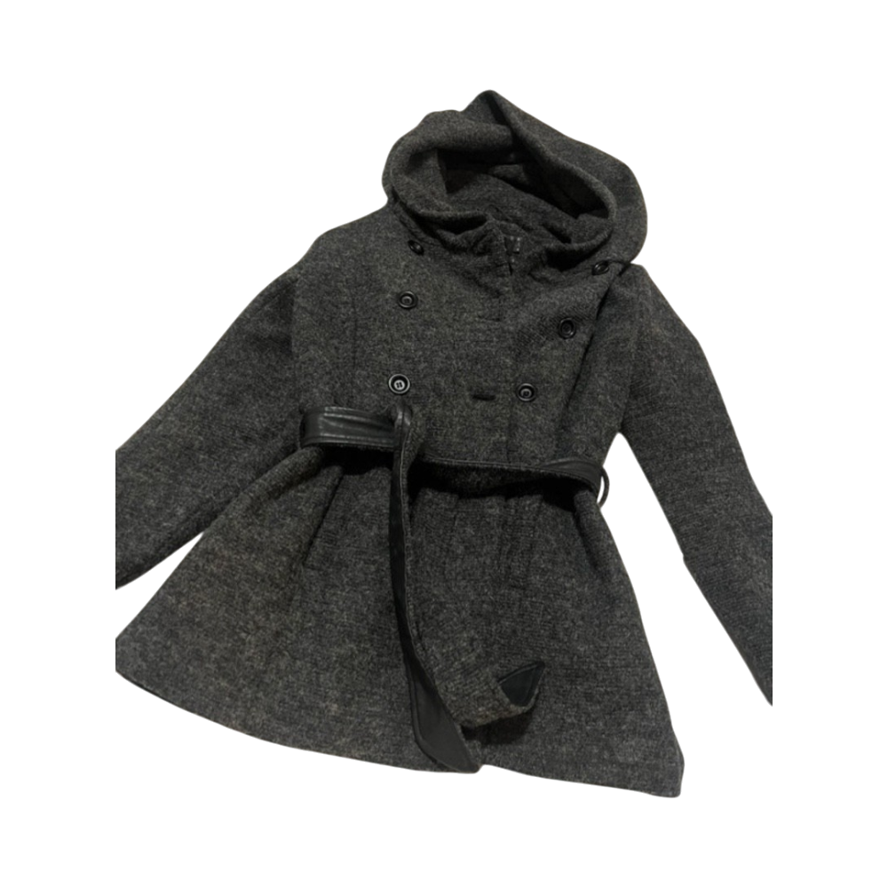 Tummanharmaa villasekoitteinen vyöllinen takki hupulla.