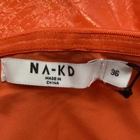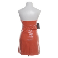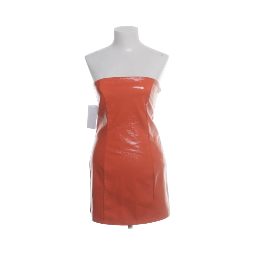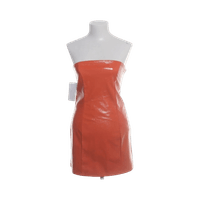 Oranssi PVC-tyylinen, vartaloa myötäilevä strapless-mekko. Laput kiinni.