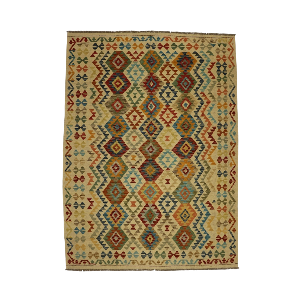 Vintage tyyliltään käsinkudottu kelim-matto värjätty kasviväreillä. Materiaali 100% villaa. Kelim matto on peräisin Afganistan ja Pakistan raja alueelta.
