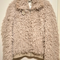 Karvatakki, jossa vetoketju edessä. Kauluksessa nepparikiinnitys. Takissa sivutaskut ja satiinivuori. Hihoissa ja alaresori keinonahkaa.