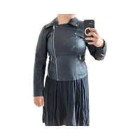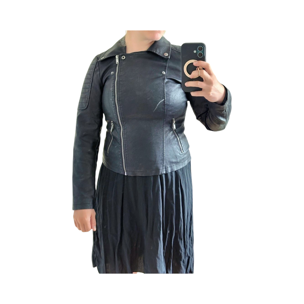 Keinonahkainen biker-takki, koko M, siisti käytetty kunto. Kauluksesta nahka vähän kärsinyt muttei juurikaan käytössä näy