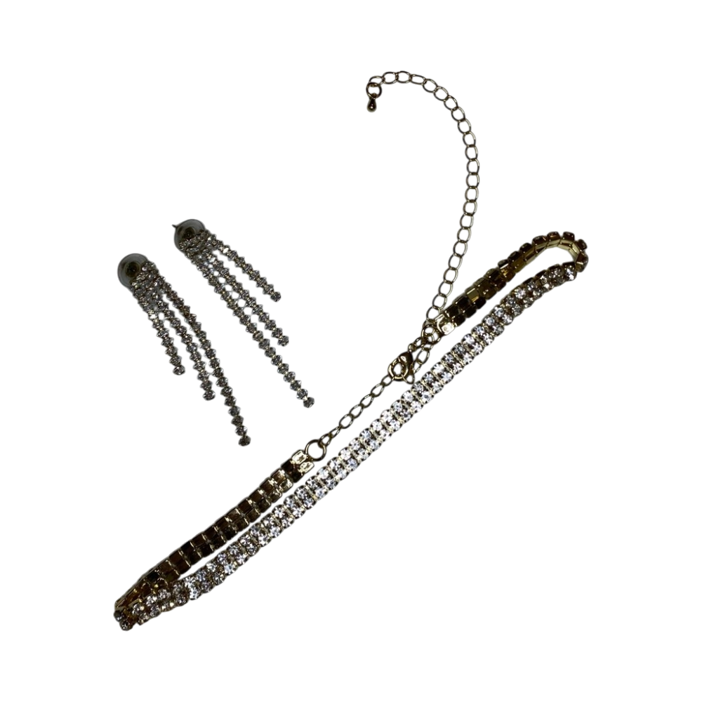 Upeat pitkät korvakorut ja kimaltava kultapohjainen kaulakoru, joissa säihkyvät kirkkaat strassit. Täydellinen valinta bileisiin, juhliin tai illallistreffeille 💎