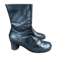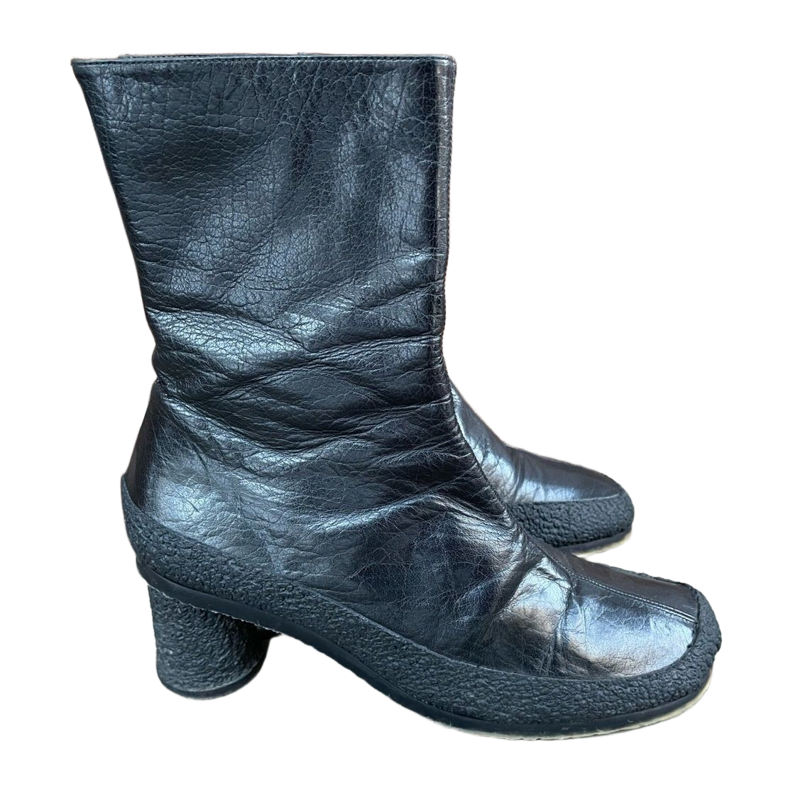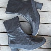 Muxart Barcelona nilkkurit. Kokonaan nahkaa, myös sisältä (nahkavuori ja sisäpohjallinen). Miellyttävät käytössä, jalat eivät hikoile. Pohjan kumimateriaali nousee pari pari senttiä, mikä suojaa kenkää kosteudelta. Korko noin 7,5 cm. Siro nilkkaosuus, istuu kauniisti, kengän suuaukko ei jää avoimeksi. Hyväkuntoiset, vähän käytetty. Koko 38 1/2. Normaali istuvuus kapeahkolle, normaalille jalalle.