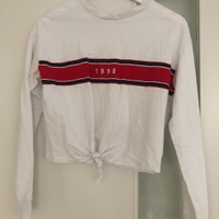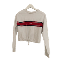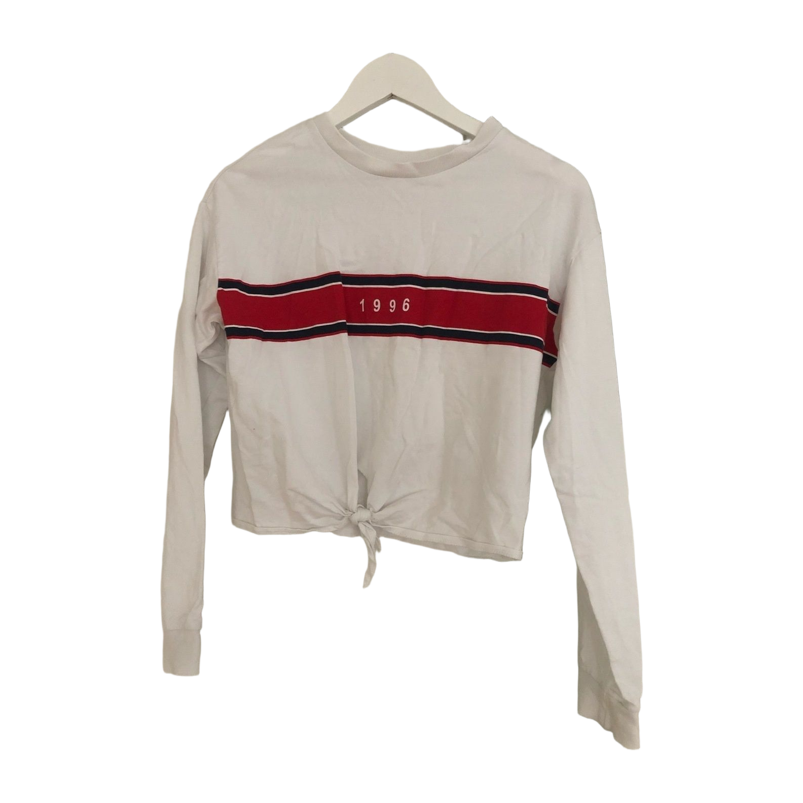 White long-sleeve crop top with red and navy stripe detail and “1996” text on the front. Tie-front detail adds a casual and trendy vibe. Size XS/S, excellent condition.