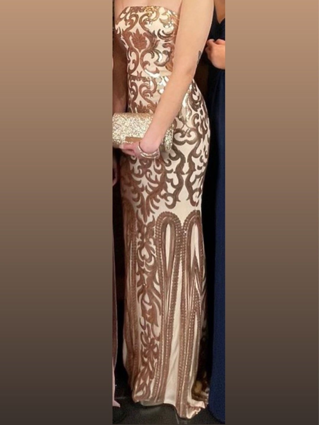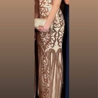 Stunning Nelly evening gown, size S / EU 36. Beige dress with elegant golden sequin embellishments. Length approx. 140 cm at the front, slightly longer at the back with a small train. Worn only once, in excellent condition. Perfect choice for prom, graduation, or any formal event!