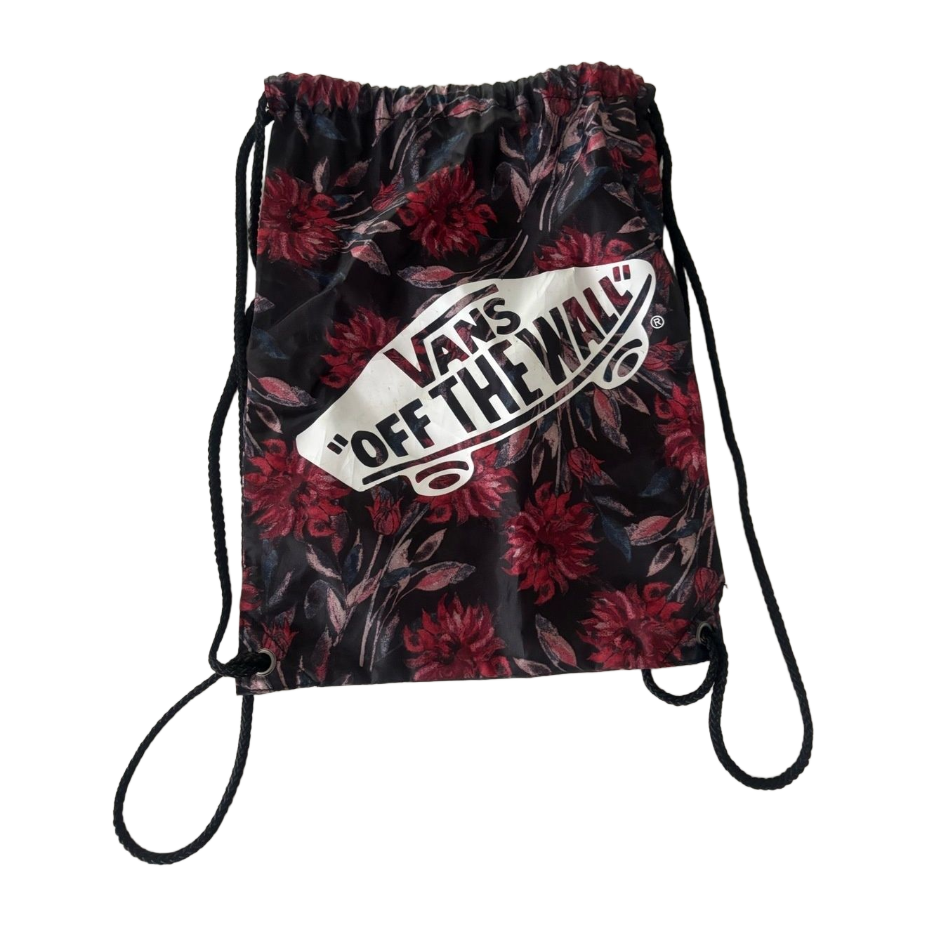 Vans “Off The Wall” drawstring gym bag with a striking black and red floral print and white logo. Lightweight, durable, and easy to carry with rope straps. Perfect for the gym, school, or casual everyday use. Excellent condition.