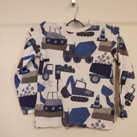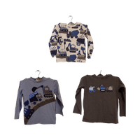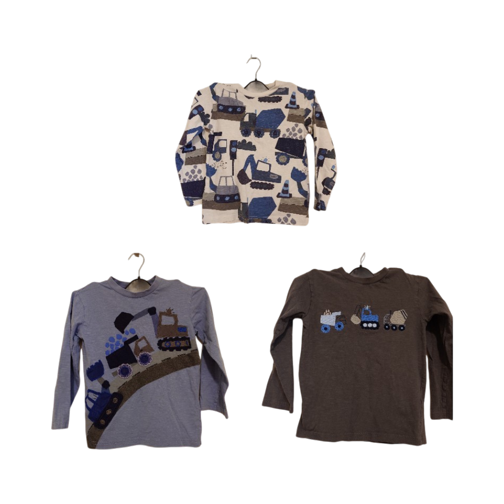 Kolme pitkähihaista lasten paitaa kuormaaja- ja traktori-kuoseilla.