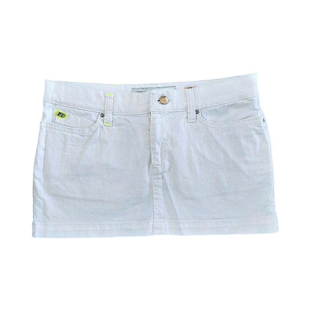 Hyväkuntoinen valkoinen kevyesti joustava farkkuhame, koko XS. Kokonaispituus keskellä edessä 27 cm. Nappia siirretty (katso neljäs kuva). Takana pieni jälki, katso viimeinen kuva. Ihanat neonkeltaiset yksityiskohdat.