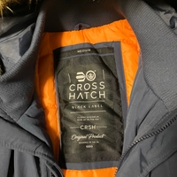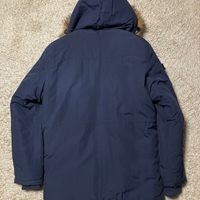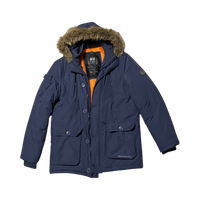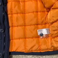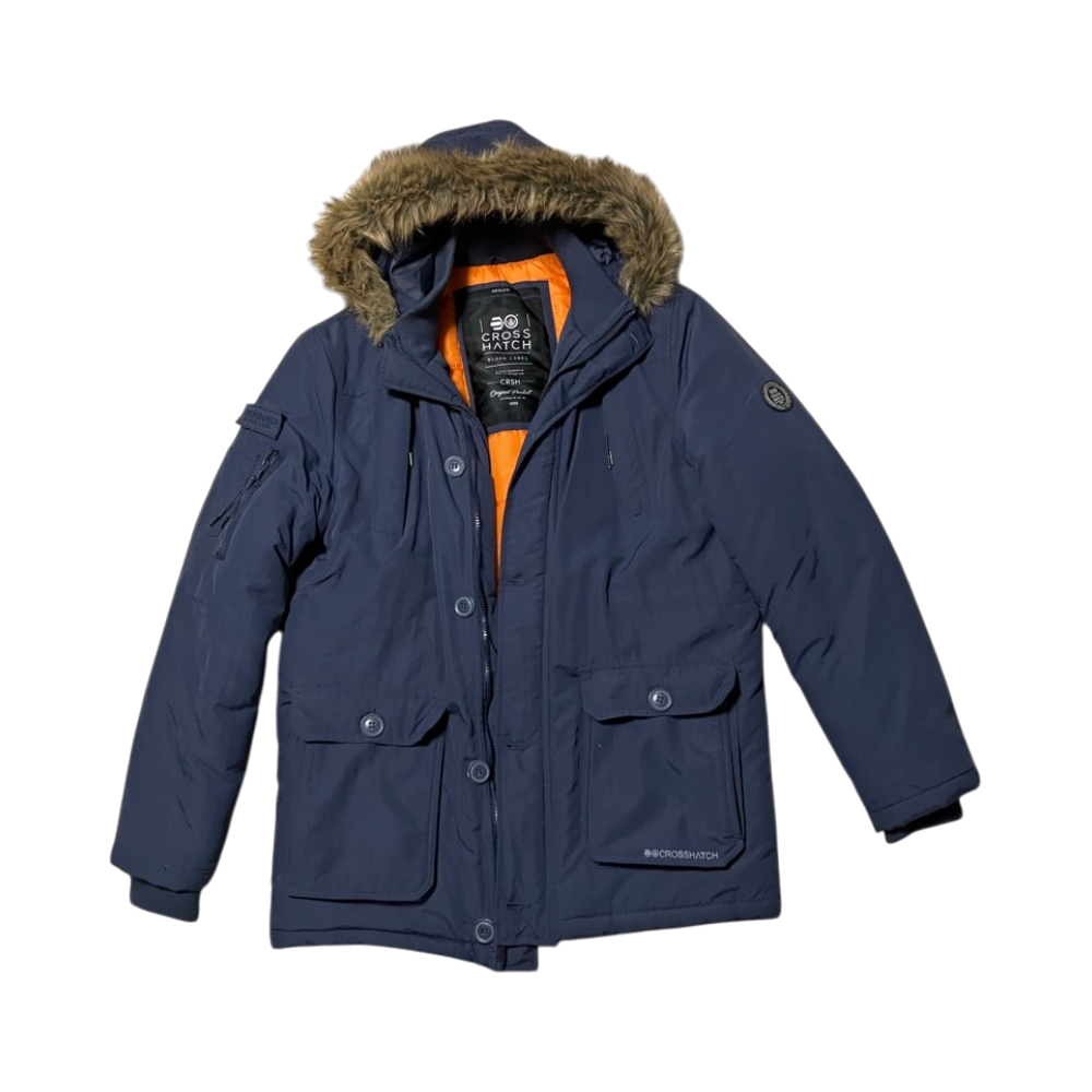 Paksu hupullinen miesten talvitakki, oranssi vuori ja karvareunus.