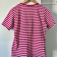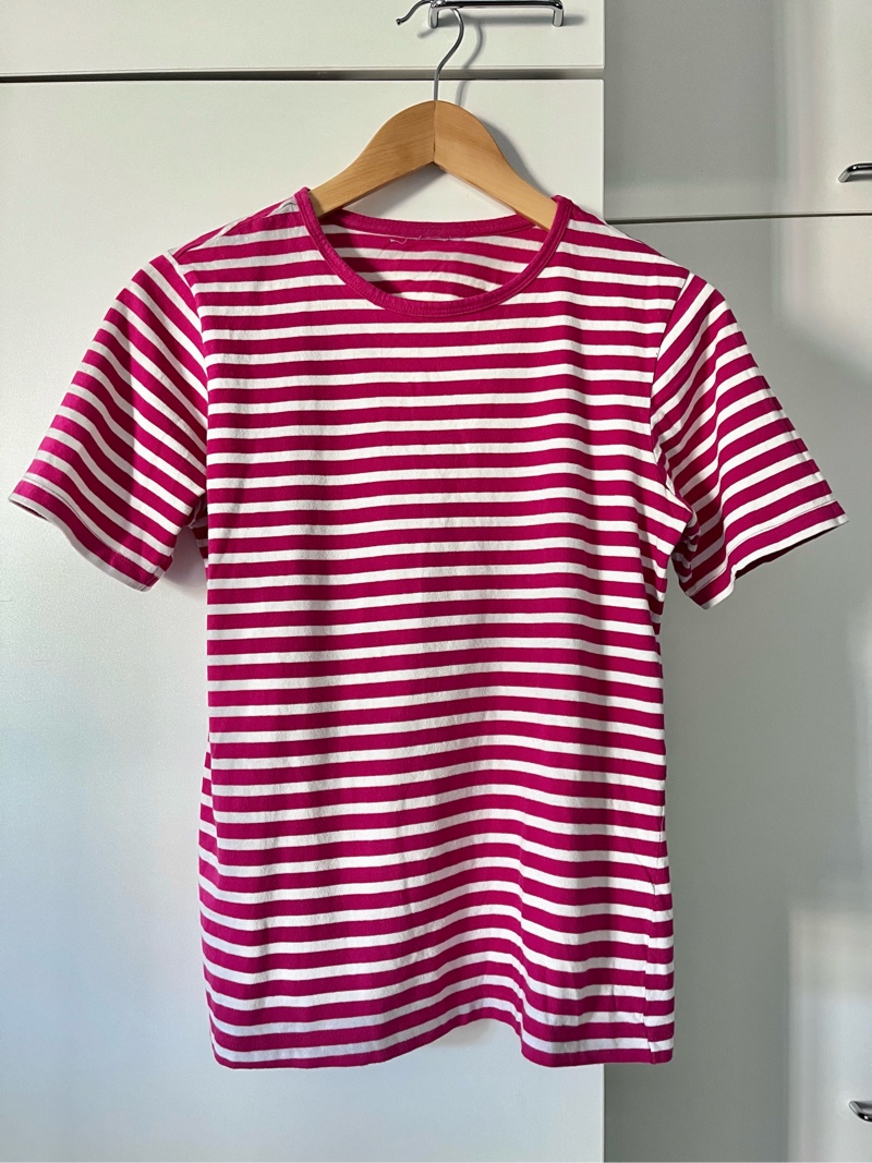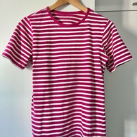 Raidallinen t-paita, valkoista ja fuksiaa. Laput leikattu mutta vastaa kokoa S. Siistissä kunnossa