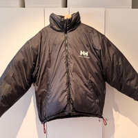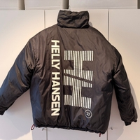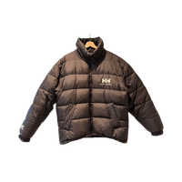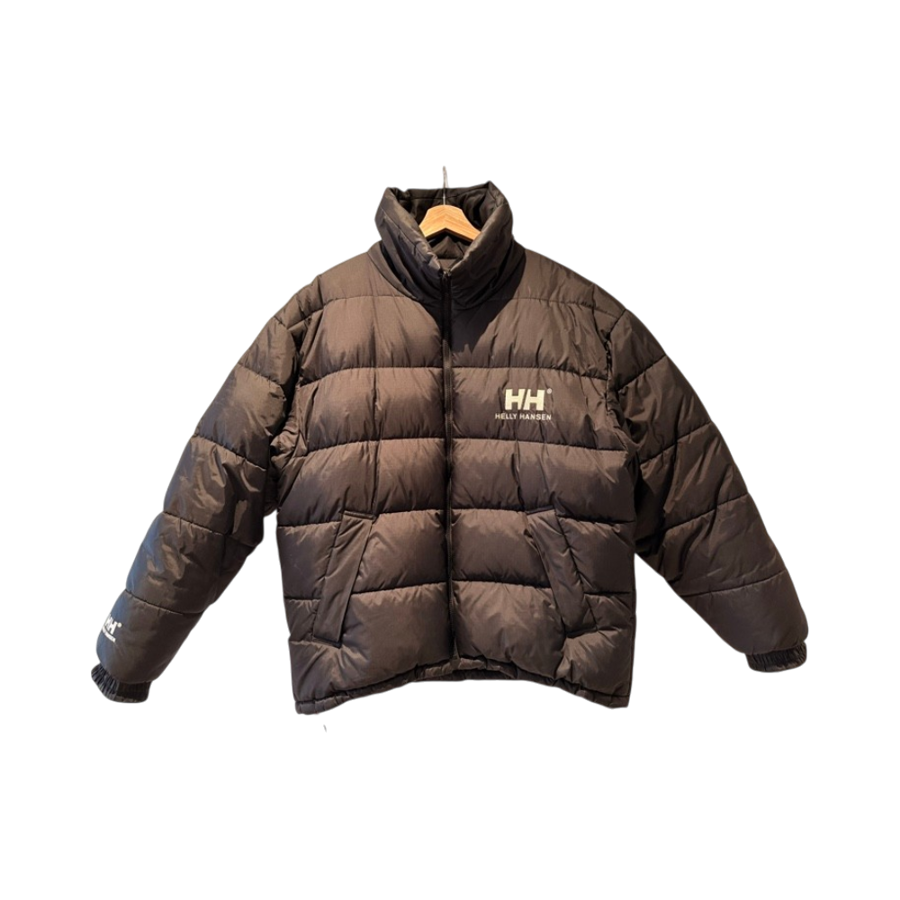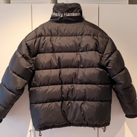 Black insulated puffer jacket with logo, warm winter outerwear. 80% down, 20% feather.