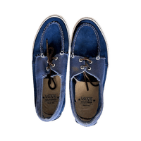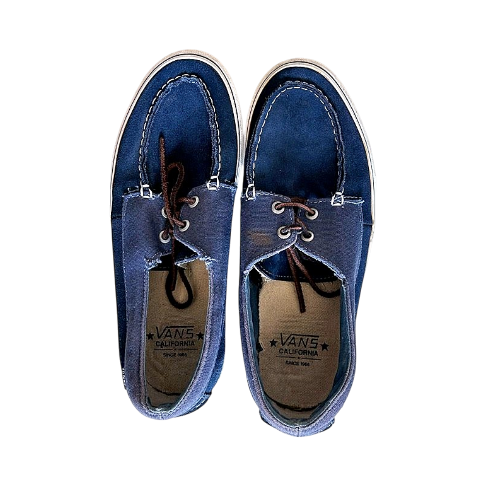 Tummansiniset purkkarityyliset Vansit💙Käytönjälkiä valkoisissa osissa ja oikean jalan kengessä tahra narujen vieressä vasemmalla (katso kuva 5). Kenkien koko men US 10.5 ja women US 12.