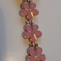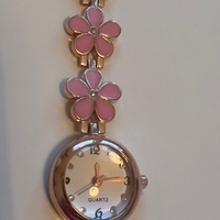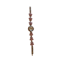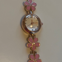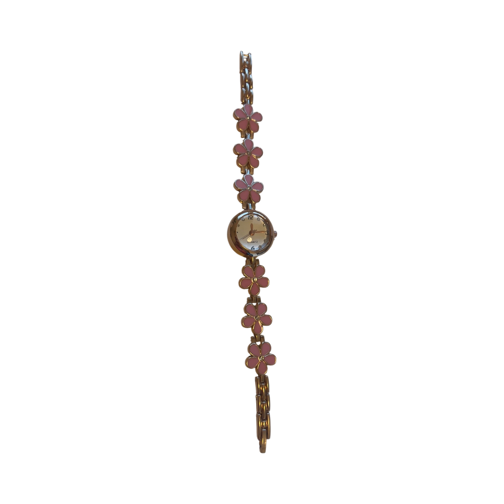 Pieni rannekello kukkakoristeilla, kullanvärinen ja vaaleanpunainen.
