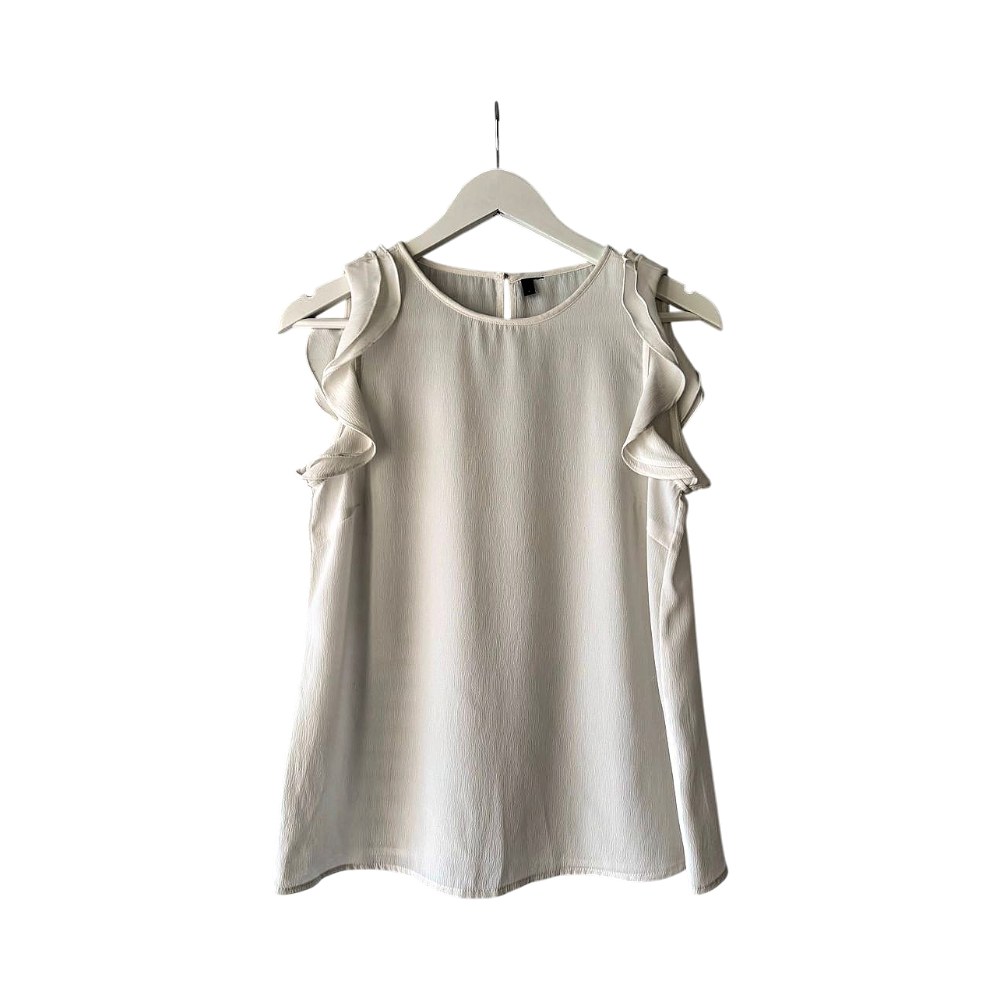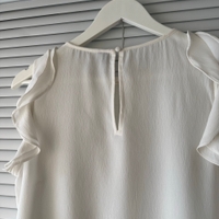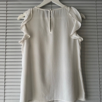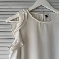 Erinomaisessa kunnossa oleva Vero Moda valkoinen toppi koossa S. Hihansuissa röyhelöt. Takana nappikiinnitys. Ei pesulappua/materiaalitietoja tallessa, mutta materiaali on todennäköisesti polyesteria. Savuton koti, ei lemmikkejä.