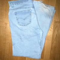 Vaaleansiniset farkut. Lapusssa lukee W 32 ja 100% puuvillaa, mutta materiaali tuntuu hiukan venyvältä. Lahkeet kuluneet käytössä, muuten ihan hyvässä kunnossa. Ostettu secondhandina, merkkiä Ever.