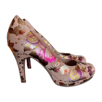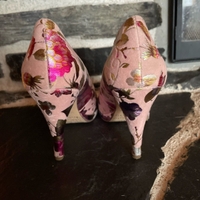 Kauniit vaaleanpunaiset korkokengät (korko 6cm) hologrammimaisilla kukkakuvioilla. 🌸 Kengän pinta samettimainen. Kerran käytetyt. Oma kengänkoko 38 joten itselle tiukat mutta kengät vastaa kyllä omaa kokoaan 37.