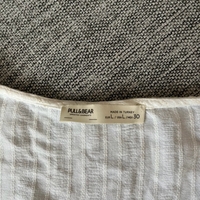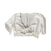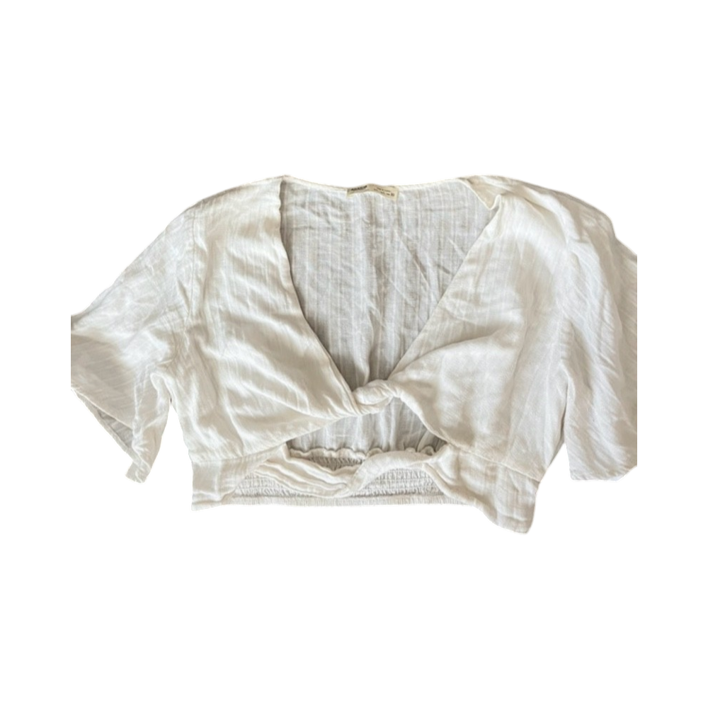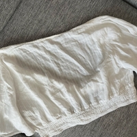 Lyhyt valkoinen solmitoppi, joustova alaosa, kevyt kangas. Leveys 37 cm, korkeus 33 cm.