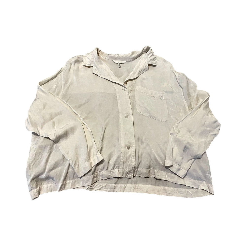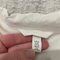 H&M paita XL-koko, väri valkoinen. Materiaali 100% viskoosia. 3 nappia edessä, kaulus ja rintatasku. Läpikuultava ja lyhyen mallinen. Säilytyksessä rypistynyt. Varanappi myös mukana.